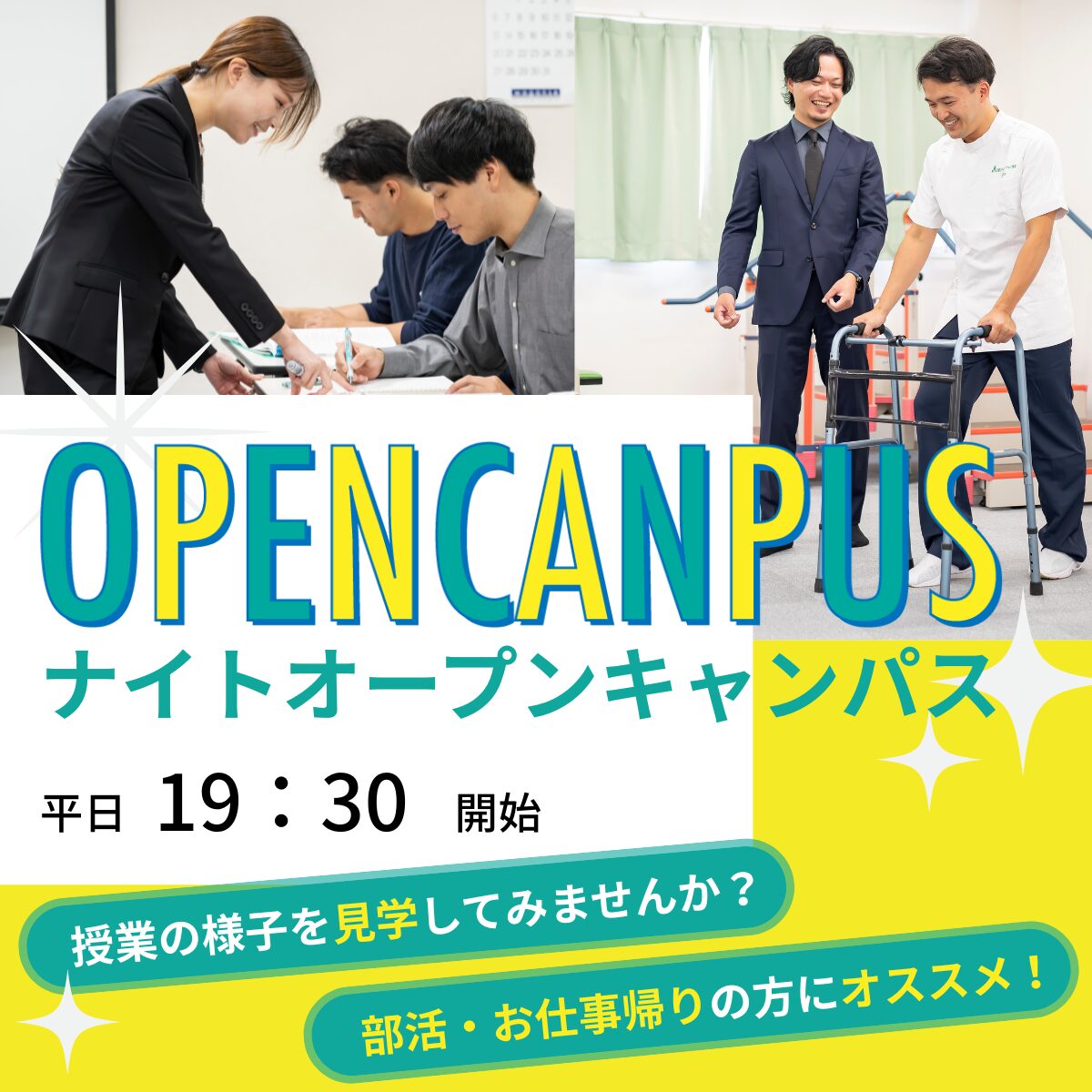 ナイトオープンキャンパス ナイトオープンキャンパス 2025. 8.20 水 19:30~20:30 夜間部学生さんの授業風景を見て頂けます!真剣に勉強している様子が分かります。どのような雰囲気でどのような人が学びに来ているのかを見て感じてください。講義と実技授業と両方があります。 参加エントリーフォーム 氏名 ヨミガナ 性別 男性 女性 生年月日 西暦 -- 1900 1901 1902 1903 1904 1905 1906 1907 1908 1909 1910 1911 1912 1913 1914 1915 1916 1917 1918 1919 1920 1921 1922 1923 1924 1925 1926 1927 1928 1929 1930 1931 1932 1933 1934 1935 1936 1937 1938 1939 1940 1941 1942 1943 1944 1945 1946 1947 1948 1949 1950 1951 1952 1953 1954 1955 1956 1957 1958 1959 1960 1961 1962 1963 1964 1965 1966 1967 1968 1969 1970 1971 1972 1973 1974 1975 1976 1977 1978 1979 1980 1981 1982 1983 1984 1985 1986 1987 1988 1989 1990 1991 1992 1993 1994 1995 1996 1997 1998 1999 2000 2001 2002 2003 2004 2005 2006 2007 2008 2009 2010 2011 2012 2013 2014 2015 2016 2017 2018 2019 2020 2021 2022 2023 2024 2025 2026 年 -- 1 2 3 4 5 6 7 8 9 10 11 12 月 -- 1 2 3 4 5 6 7 8 9 10 11 12 13 14 15 16 17 18 19 20 21 22 23 24 25 26 27 28 29 30 31 日 参加希望日 2026年1月25日(日) 10:00~11:30【特別オープンキャンパス】 2026年1月29日(木) 19:30~20:30【ナイトオープンキャンパス】 2026年2月4日(水) 19:30~20:30【ナイトオープンキャンパス】 2026年2月7日(土) 10:00~11:30【オープンキャンパス】 2026年2月10日(火) 19:30~20:30【ナイトオープンキャンパス】 2026年2月15日(日) 10:00~11:30【特別オープンキャンパス】 2026年2月19日(木) 19:30~20:30【ナイトオープンキャンパス】 2026年2月21日(土) 10:00~11:30【オープンキャンパス】 2026年3月1日(日) 10:00~11:30【特別オープンキャンパス】 2026年3月12日(木) 19:30~20:30【ナイトオープンキャンパス】 2026年3月14日(土) 10:00~11:30【オープンキャンパス】 2026年3月18日(水) 19:30~20:30【ナイトオープンキャンパス】 2026年3月18日(水) 19:30~20:30【ナイトオープンキャンパス】 2026年3月29日(日) 10:00~11:30【特別オープンキャンパス】 学年・ご職業 高校3年生 高校2年生 高校1年生 大学生 専門学校生 予備校生 社会人 その他 電話番号 - - メールアドレス ドメイン指定受信を設定されている場合は、以下のドメインを受信できるように設定してください。「@kinki-reha.com」 住所 Japan 郵便番号 〒 - 都道府県市区町村 番地 建物名部屋番号 下宿相談 希望する 希望しない ※本校が提携している不動産業者から直接ご案内を受けることができます。 ※下宿相談希望の場合は、参加を希望されるオープンキャンパス開催の一週間前までにお申し込みください。(一週間前を過ぎてのお申込みの場合、下宿相談の受付は出来かねます。予めご了承ください。また、夜間見学会では下宿相談は実施いたしません。) 在学校名(最終学歴) 備考 ご入力いただいた個人情報は、近畿リハビリテーション学院への入学に関するご案内や情報提供およびより良い資料作成のための分析の目的にのみ使用いたします。個人情報は正当な理由がない限り、ご本人のご承諾なく業務委託先および提携先以外の第三者に開示または提供いたしません。皆様の個人情報は、本校に対していつでも登録個人情報の開示、訂正、削除を要求することができます。本学院の個人情報取扱いについての詳細は、『プライバシーポリシー』 をご覧ください。 個人情報の取扱いに同意します