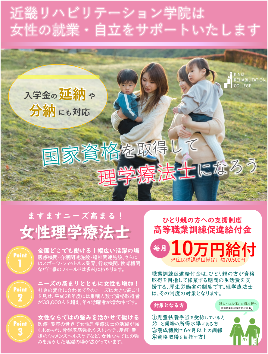 近畿リハビリテーション学院は社会人のセカンドキャリアを応援します。手に職を付けて好きな仕事をしませんか?あなたの今までの経験は必ず役に立ちます。理学療法士を目指しませんか?。(※各保証制度およびキャンペーンの併用不可)