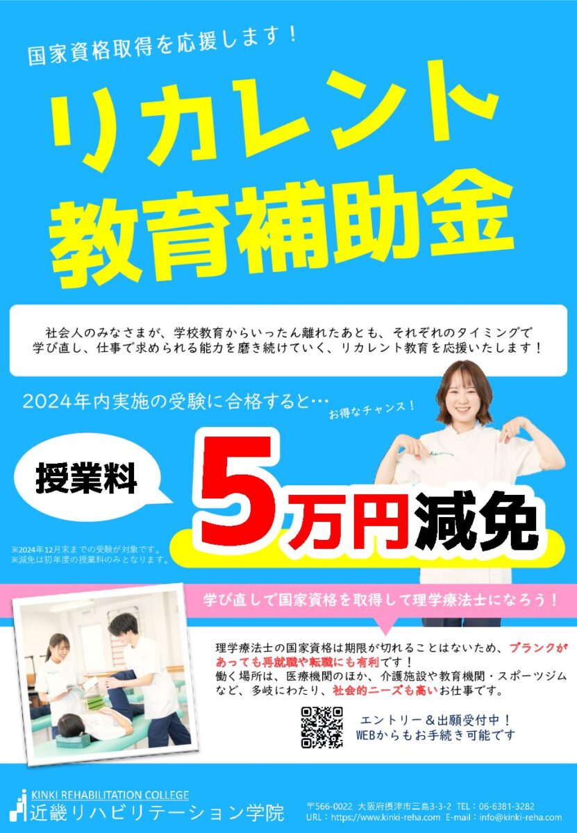 医療法人 髙寿会 近畿リハビリテーション学院では、理学療法科への進学に就学奨学金制度があります。みなさんも是非この制度を活用し、夢を叶えてください。 就学奨学金制度とは、理学療法士を目指して勉強する社会人を対象に、就学期間中に学費の一部を髙寿会グループが援助する制度です。資格取得後、奨学金を借りていたと同じ期間(3年間)を髙寿会グループに勤務すると、学費返済の半額が免除されます(いわゆる御礼奉公システムです)。(※各保証制度およびキャンペーンの併用不可)